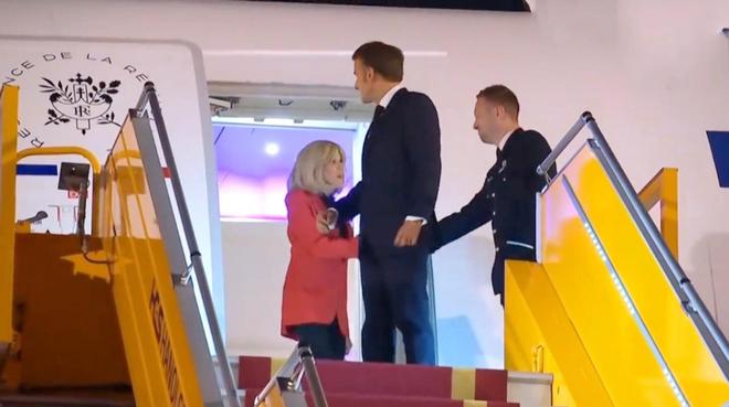 然而马克龙的夫人似乎就没有那么给面子了,只见她下飞机的全程都没有挽住马克龙的胳膊,而且还一脸的不悦。