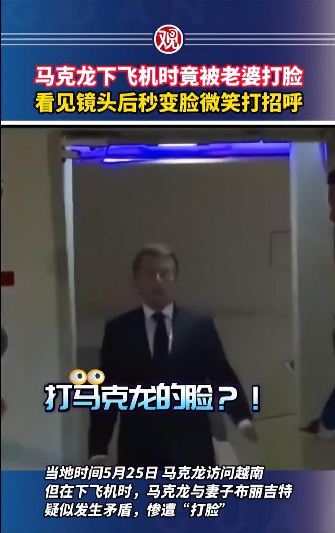 从视频画面当中能够看出,在飞机打开舱门之后,马克龙原本应该是准备带着自己的夫人一起下飞机的,但劈头盖脸就是一巴掌。